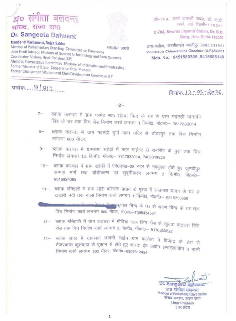 गाजीपुर में विकास को नई गति देते हुए राज्यसभा सांसद संगीता बलवंत के प्रस्ताव पर माननीय मुख्यमंत्री जी द्वारा त्वरित आर्थिक विकास योजना के अंतर्गत लगभग ₹5 करोड़ की लागत से नाला एवं सड़क निर्माण कार्य को स्वीकृति प्रदान की गई है। यह कार्य क्षेत्र में बेहतर आवागमन, जल निकासी की समस्या के समाधान तथा समग्र विकास की दिशा में एक महत्वपूर्ण कदम माना जा रहा है।
