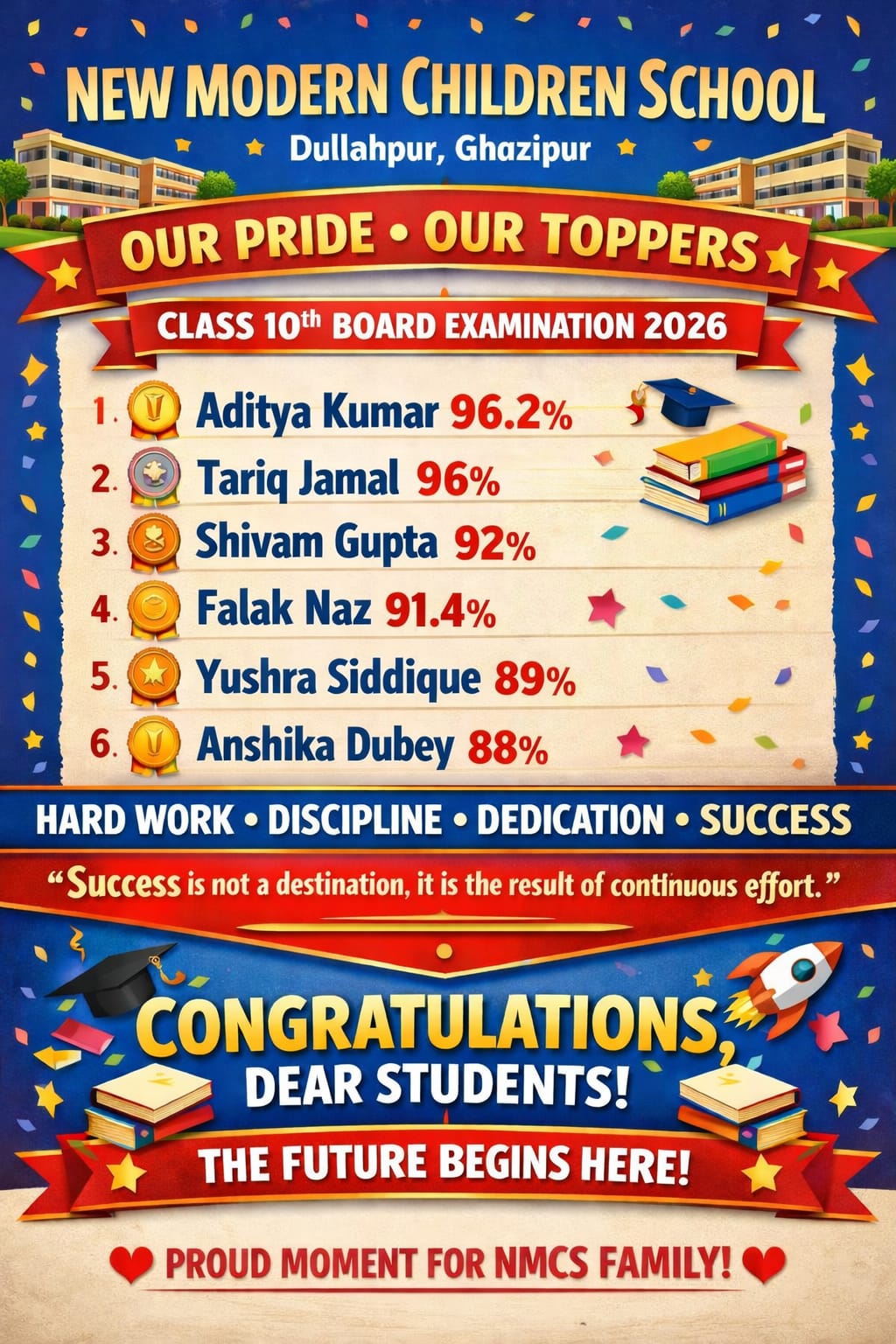 दुल्लहपुर क्षेत्र के प्रतिष्ठित शिक्षण संस्थान न्यू मॉडर्न चिल्ड्रेन स्कूल (CBSE बोर्ड) के छात्रों ने इस वर्ष परीक्षा परिणाम में शानदार प्रदर्शन कर विद्यालय ही नहीं, पूरे क्षेत्र का नाम रोशन कर दिया है। उत्कृष्ट अंक प्राप्त करने वाले विद्यार्थियों ने अपनी मेहनत और लगन से सफलता की नई इबारत लिखी है।