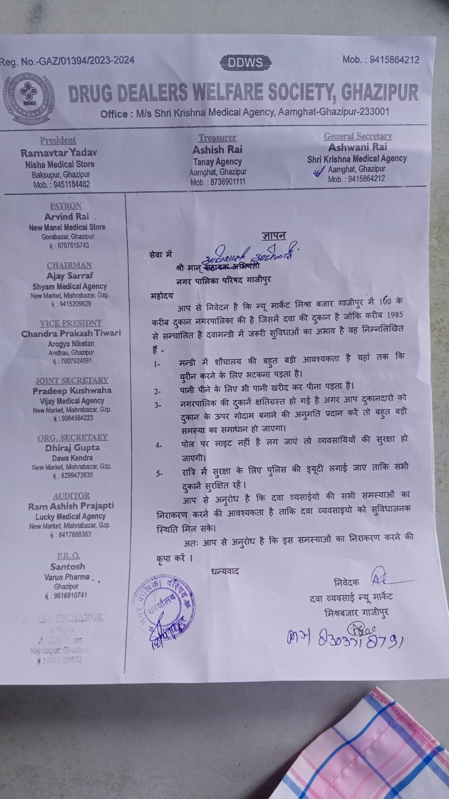 गाज़ीपुर। शहर के मिश्र बाजार स्थित पुरानी दवा मंडी की बदहाल स्थिति को लेकर ड्रग डीलर्स वेलफेयर सोसायटी, गाज़ीपुर ने शनिवार को नगर पालिका प्रशासन के खिलाफ आवाज बुलंद की। सोसायटी के महामंत्री अश्वनी राय के नेतृत्व में पदाधिकारियों ने नगर पालिका के अधिशासी अभियंता के नाम संबोधित एक पत्रक सौंपकर मंडी में व्याप्त विभिन्न समस्याओं के समाधान की मांग की।