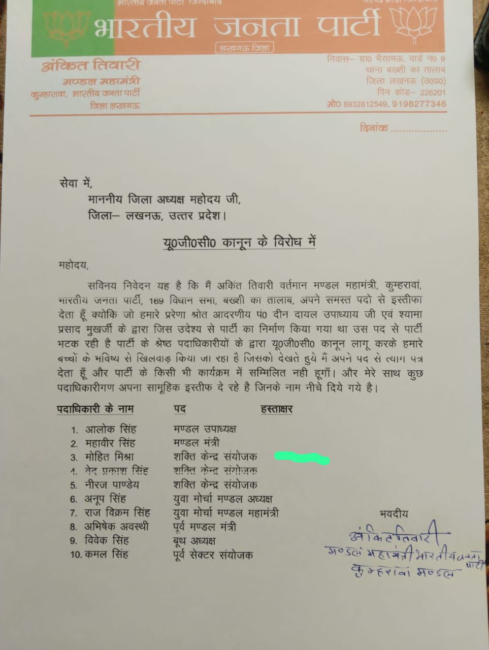 लखनऊ से बड़ी खबर: यूजीसी को लेकर भाजपा पदाधिकारी ने दिया इस्तीफा