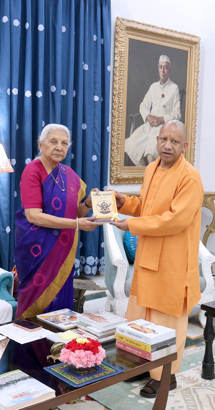 भेंट के दौरान मुख्यमंत्री योगी आदित्यनाथ जी ने राज्यपाल आनंदीबेन पटेल जी को “ग्लोबल सनातन” पुस्तक भेंट कर सम्मान प्रकट किया। राज्यपाल ने पुस्तक भेंट के लिए मुख्यमंत्री का आभार व्यक्त किया।