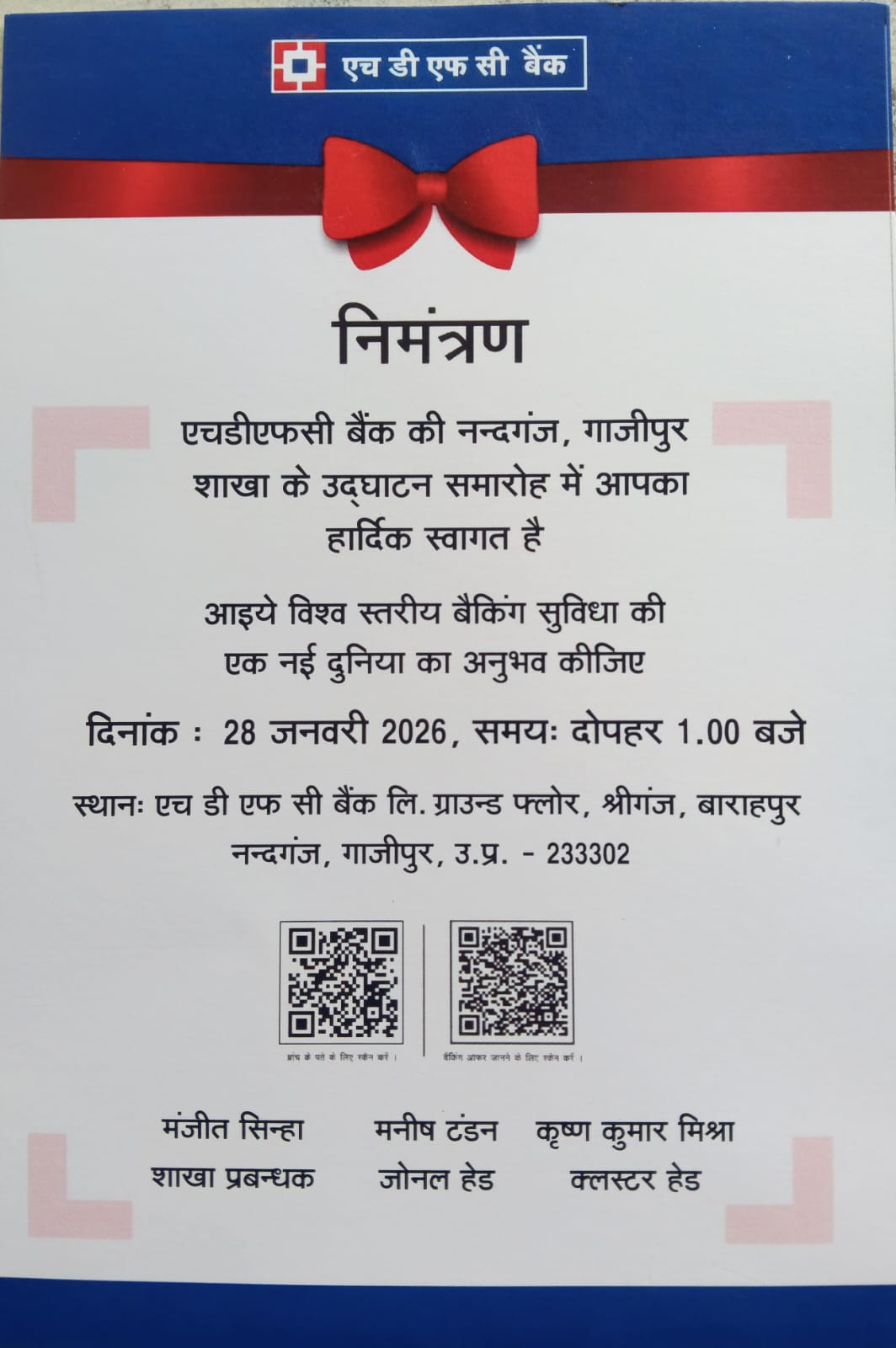 नंदगंज (गाज़ीपुर)। क्षेत्रवासियों के लिए एक बड़ी सुविधा जुड़ने जा रही है। आगामी 28 जनवरी को दोपहर 1 बजे नंदगंज में एचडीएफसी बैंक की नई शाखा का विधिवत उद्घाटन किया जाएगा। इस संबंध में जानकारी देते हुए शाखा प्रबंधक मंजीत सिन्हा ने बताया कि बैंक शाखा के खुलने से नंदगंज एवं आसपास के ग्रामीण क्षेत्रों के लोगों को बैंकिंग सेवाएं स्थानीय स्तर पर उपलब्ध हो सकेंगी।