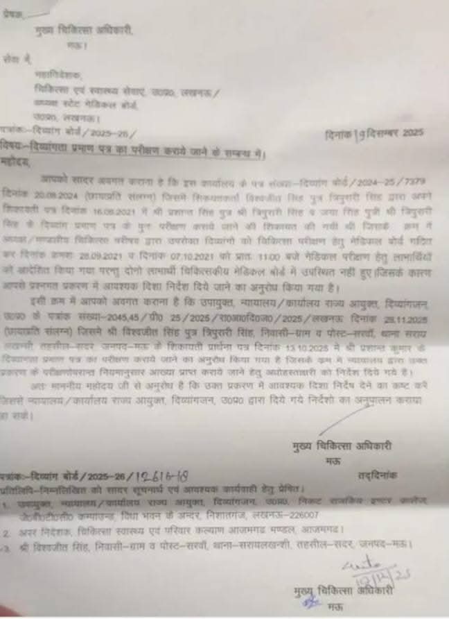 सूत्रों के मुताबिक, विभागीय स्तर पर गठित मेडिकल बोर्ड के समक्ष प्रशांत कुमार सिंह को कई बार उपस्थित होने के लिए बुलाया गया, लेकिन वह लगातार बोर्ड के सामने पेश नहीं हो रहे हैं। इसी क्रम में मऊ के मुख्य चिकित्सा अधिकारी (सीएमओ) द्वारा दिनांक 19 दिसंबर 2025 को महानिदेशक, चिकित्सा एवं स्वास्थ्य सेवाएं को पत्र भेजा गया था। इस पत्र में स्पष्ट रूप से उल्लेख किया गया है कि संबंधित अधिकारी बार-बार बुलाए जाने के बावजूद मेडिकल बोर्ड के समक्ष उपस्थित नहीं हो रहे हैं।
